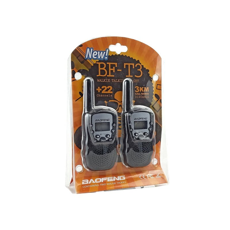 Χαρακτηριστικά : Εύρος σύνδεσης μέχρι 3 χιλιόμετρα, Max 5 χιλιόμετρα σε ανοιχτό πεδίο. Διαθέσιμα 22 κανάλια, κάθε κανάλι έχει 38 ιδιωτικούς κωδικούς. 10 Τόνοι κλήσης με 5 τόνους ήχων ζώων. Ενσωματωμένος φακός. Ρυθμιζόμενο επίπεδο έντασης. Με τόνους πληκτρολογίου και κλείδωμα πληκτρολογίου για την αποφυγή τυχαίων αλλαγών. Τόνος επιβεβαίωσης συνομιλίας. Απόδοση μπαταρίας και ηχητική ειδοποίηση χαμηλής μπαταρίας. Το σετ περιλαμβάνει 2 συσκευές. Λειτουργεί με 3x «AAA» μπαταρίες (δεν περιλαμβάνονται). Διαστάσεις : 14.5 x 5.5 x 3.5 cm.