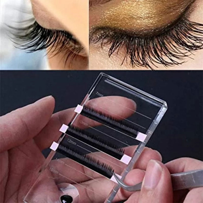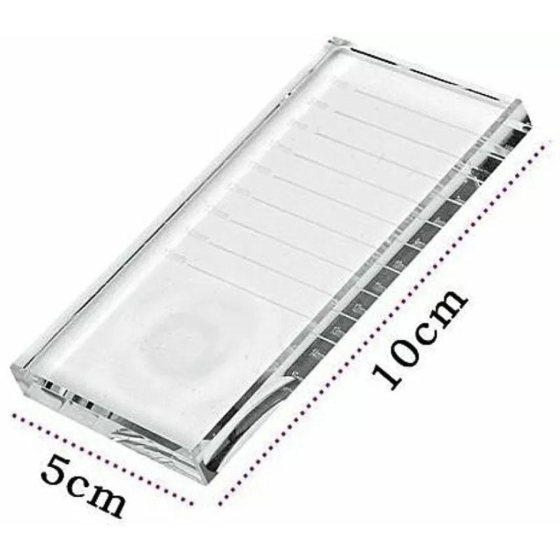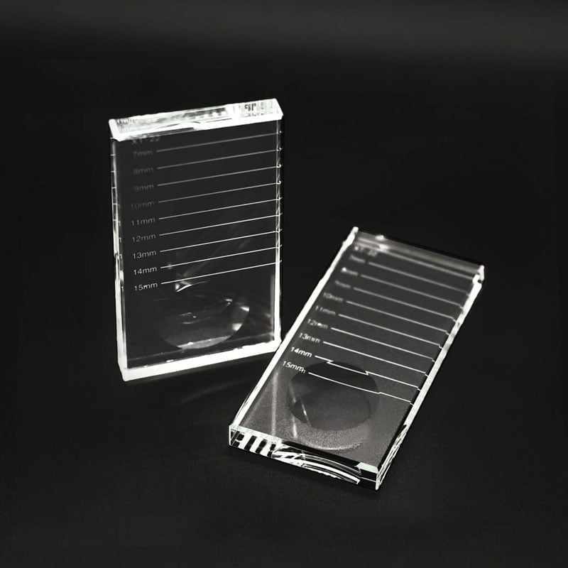 Διάφανος κρύσταλλος παλέτα τοποθέτησης βλεφαρίδων. Οι γραμμές δείχνουν το μήκος των βλεφαρίδων που χρησιμοποιούνται για να γίνει πιο γρήγορα και εύκολη η διαδικασία. Η παλέτα είναι κατασκευασμένη από τεχνητό κρύσταλλο, καθιστώντας δύσκολη τη μετακίνηση της κατά τη διάρκεια της διαδικασίας. Πλένεται, επαναχρησιμοποιείται και είναι εύκολο να καθαριστεί.
