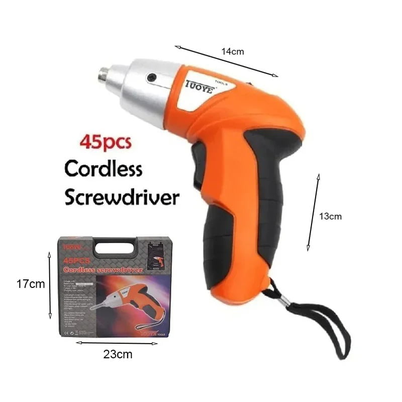 Tuoye – Cordless Screwdriver Tool Set. Ελαφριά κατασκευή με συρόμενο διακόπτη προς τα εμπρός/πίσω, εύκολο βίδωμα/ξεβίδωμα. Ένα σετ 45 τεμαχίων που ποικίλλει από βίδες, μύτες και τρυπάνια.