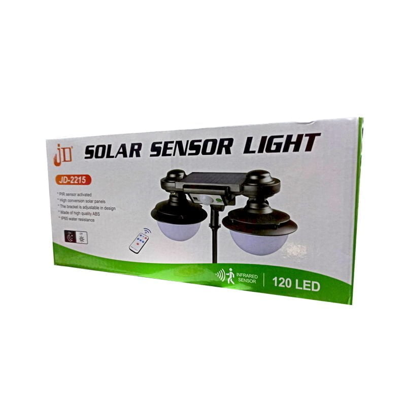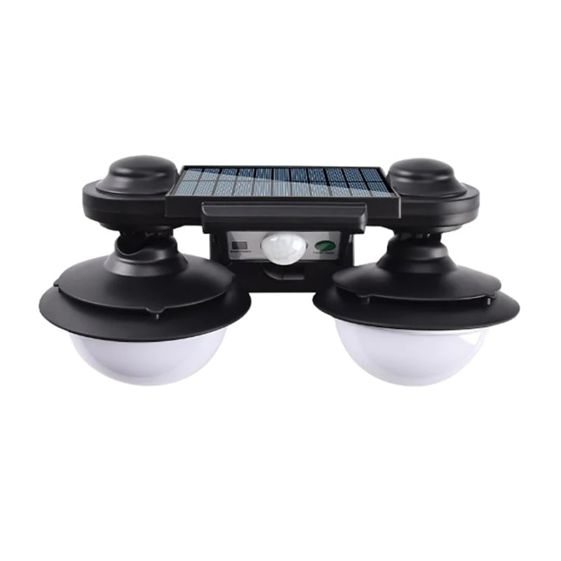 Ηλιακοί προβολείς/φανάρια με 2 λάμπες, αισθητήρα κίνησης και όμορφο σχεδιασμό κατάλληλο για απόλυτα οικονομικό φωτισμό του κήπου, του μπαλκονιού σας ή κάθε άλλου υπαίθριου χώρου, με ασύρματη τοποθέτηση χωρίς καλώδια. 3 λειτουργίες: Mode 1: Ενεργοποίηση με τον εντοπισμό κίνησης και απενεργοποίηση 15” μετά. Mode 2: Μόνιμα ενεργοποιημένο στον χαμηλό φωτισμό, ενδυνάμωση φωτισμού μόλις εντοπιστεί κίνηση, επαναφορά στον χαμηλο φωτισμό. Mode 3: Μόνιμα ενεργοποιημένο στον χαμηλό φωτισμό Ηλιακό πάνελ: 5V Θερμοκρασία φωτισμού: 6500k white light Ισχύς: 20w Lumens: 500lm Ενσωματωμένη μπαταρία: 2400mah Υλικό: High grade ABS Αδιάβροχο: IP65 Περιλαμβάνεται τηλεχειριστήριο Διαθέτει ειδικό πάσαλο τοποθέτησης στο έδαφος του κήπου Διαστάσεις: 26 x 13cm