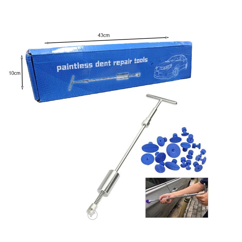 Χάρη στο πλήρες σύστημα αφαίρεσης βαθουλωμάτων, μπορείτε να επισκευάσετε μόνοι σας το αμάξωμα του αυτοκινήτου σας, διορθώνοντας όλα τα μικρά βαθουλώματα από αυτό. Ένα μεταλλικό σφυρί ολίσθησης και ένα σετ εναλλάξιμων προσαρμογέων διαφορετικών διαμέτρων, θα σας επιτρέψουν να επισκευάσετε μόνοι σας το σημείο που επιθυμείτε. Σας επιτρέπει να διορθώσετε βαθουλώματα από ένα μεταλλικό σώμα χωρίς να χρειαστεί να το βάψετε μετά.