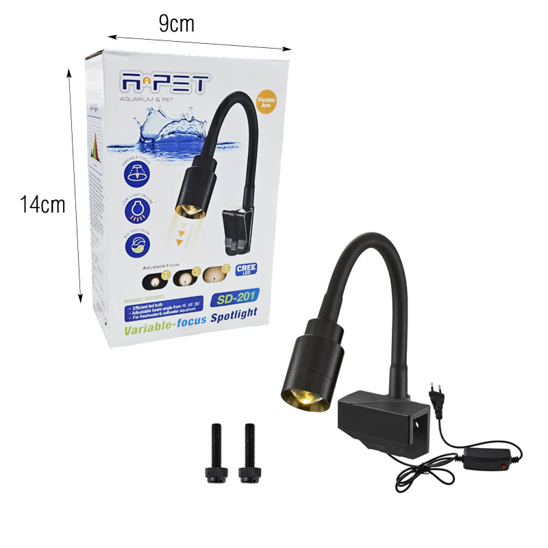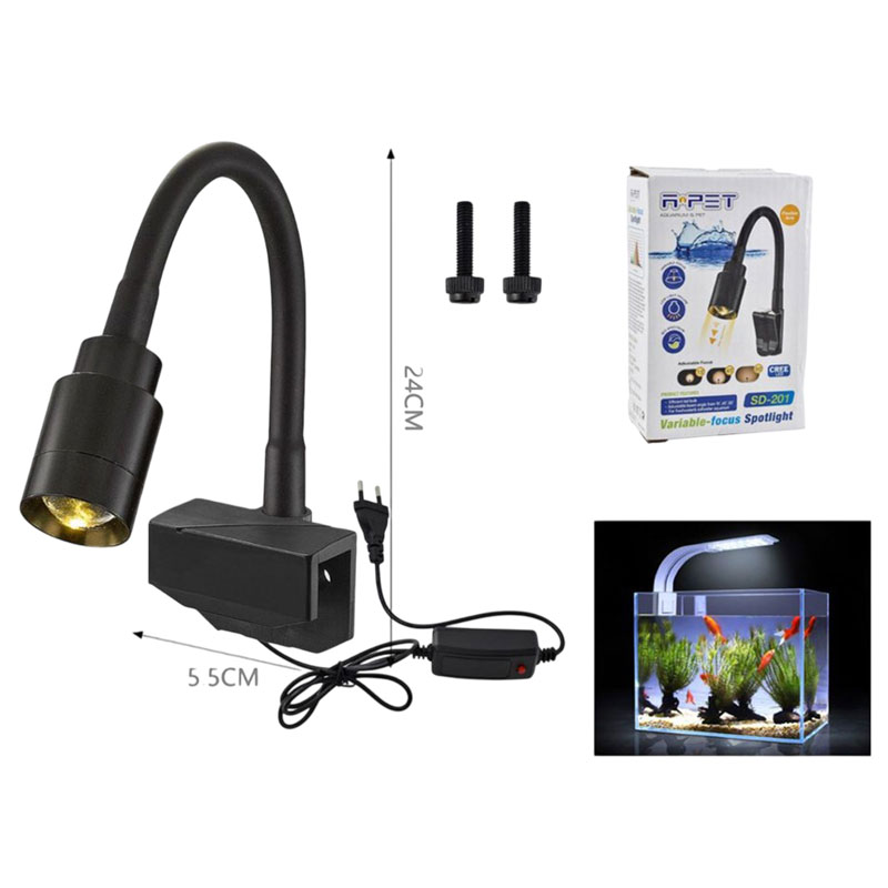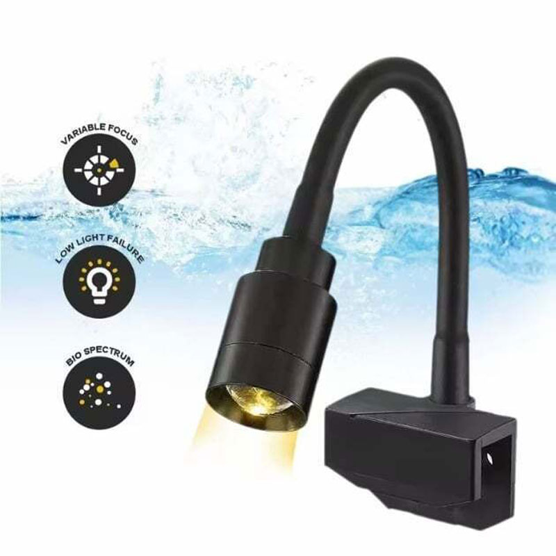 Το φωτιστικό ενυδρείου LED με ρυθμιζόμενο εστιασμό και ευλύγιστο βραχίονα προσφέρει ιδανικό φωτισμό για τα ψάρια και τα φυτά σας, ενισχύοντας την ανάπτυξη και την ομορφιά του ενυδρείου. Διαθέτει τεχνολογία χαμηλής κατανάλωσης με λάμπα Cree LED, ρυθμιζόμενη γωνία φωτισμού από 15° έως 60° και ανθεκτική κατασκευή. Εύκολη τοποθέτηση στο ενυδρείο και κατάλληλο για χρήση σε γλυκό και θαλασσινό νερό.