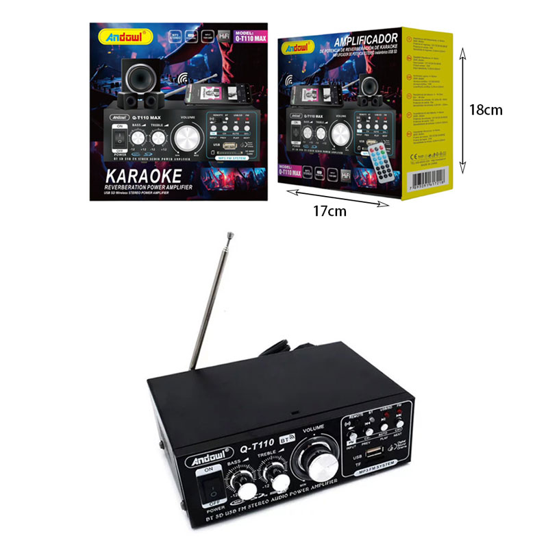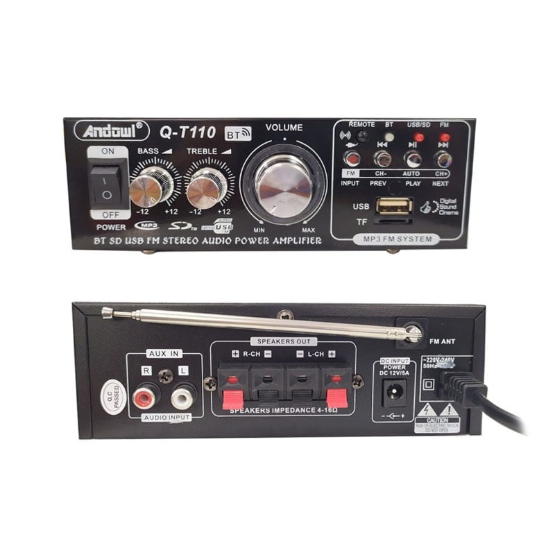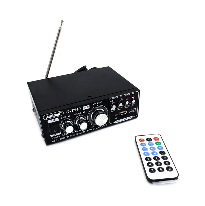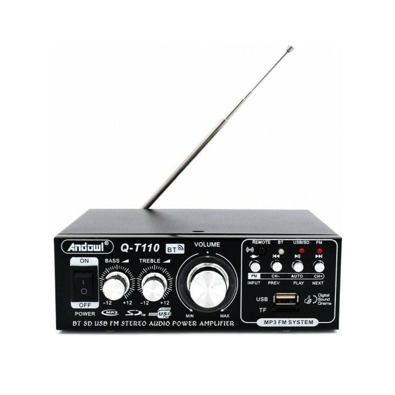 Bluetooth ενισχυτής ήχου Andowl Q-T110, με τηλεχειριστήριο, επεκτάσιμη κεραία και λειτουργία ραδιφώνου FM. Διαθέτει είσοδο USB και SD και έλεγχο έντασης ήχου, μπάσων και πρίμων για να ακούτε ευχάριστα την αγαπημένη σας μουσική.
