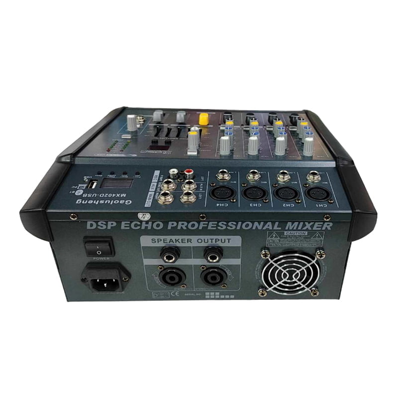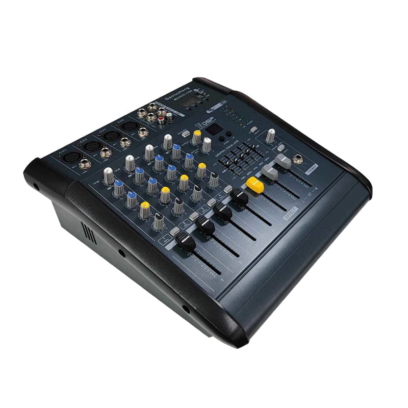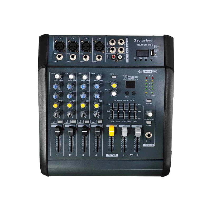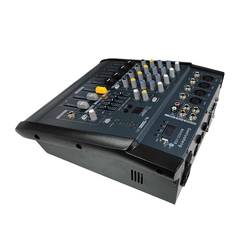 μίξερ nalog, σχεδιασμός κυκλώματος εξαιρετικά χαμηλού θορύβου υψηλής ποιότητας, χώρος κεφαλής Είσοδος μικροφώνου/γραμμής 4/8/12 καναλιών Κανάλι ισοσταθμιστή δύο κυμάτων, ζεστή ηχόχρωμα, μιούζικαλ Το οπίσθιο εφέ που μεταφέρει ένα putter ανά κανάλι για εξωτερικές συσκευές εφέ Ενσωματωμένα ψηφιακά μικτά αναπνευστικά εφέ 16 DSP Ο σχεδιασμός πρόσβασης USB, με οθόνη LCD, μπορεί να τοποθετηθεί απευθείας σε δίσκο U για αναπαραγωγή μουσικής MP3 48V phantom power για υποστήριξη της άμεσης χρήσης συμπυκνωτικών μικροφώνων Κύριος σχεδιασμός εξόδου στερεοφωνικού ισοσταθμιστή 5 ζωνών Έξοδος παρακολούθησης/εγγραφής στερεοφωνικών ακουστικών Ένδειξη επιπέδου 2 δρόμων υψηλής ακρίβειας Οι βαθμοί υψηλών 60 χιλιοστών ανθεκτικοί με faders Υψηλής ποιότητας εξαρτήματα και εξαιρετικά στιβαρή κατασκευή, ανθεκτικότητα Απόκριση συχνότητας 20~20 kHz THD+N ≤0,4% (1KHz, 0,775V) Αναλογία S/N ≥85dB Τάση ισχύος 160V~240V 50/60Hz Εξίσωση LF 80Hz±15dB MF 2,5KHz±15dB HF 12KHz±15dB Εξάρτημα ενισχυτή Ισχύς εξόδου 200W×2(4Ω) THD+N ≤0,05%(1KHz,80Ω)