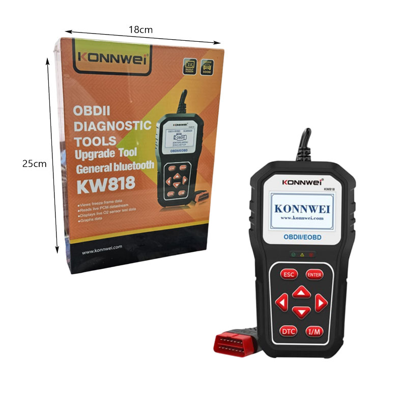 Κάνε τη διάγνωση του αυτοκινήτου σου εύκολη και αξιόπιστη με το διαγνωστικό εργαλείο KONNWEI KW818. Συμβατό με όλα τα οχήματα που υποστηρίζουν OBDII/EOBD, διαθέτει μεγάλη οθόνη, εύχρηστο μενού και πλήκτρα για άμεση πλοήγηση.
