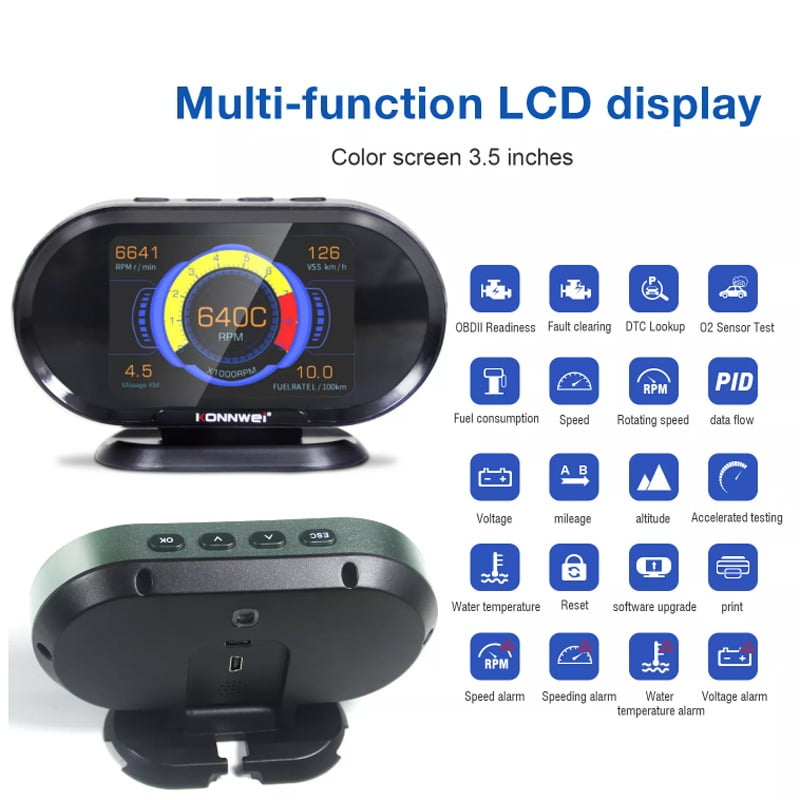 Λειτουργίες: OBDII + EOBD διαγνωστικό κινητήρα Ανάγνωση & σβήσιμο σφαλμάτων Ταχύμετρο Θερμοκρασία κινητήρα Θερμοκρασία λαδιού Τάση μπαταρίας Χλμ/ώρα 0-100 Ειδοποίηση VSS, RPM, VOL Χαρακτηριστικά: Οθόνη: 3.5″ TFT Έγχρωμη Θερμοκρασία λειτουργίας: 0 ∼ 60 ℃ Θερμοκρασία αποθήκευσης: -20 ∼ 70℃ Τροφοδοσία: 8.0 – 18.0V από την μπαταρία του αυτοκινήτου Διαστάσεις: 130 x 25.8 x 84mm Βάρος: 0.3kg – 0.4kg Χρώμα: Μαύρο
