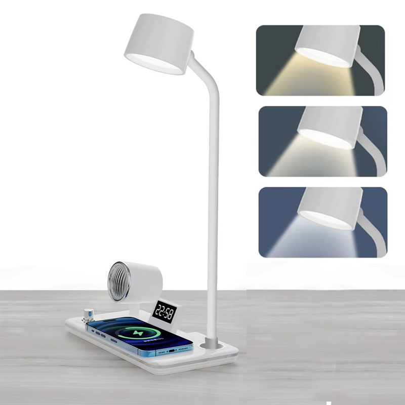Πολυλειτουργικό LED φωτιστικό γραφείου 4 σε 1 σε λευκό χρώμα, που συνδυάζει στυλ, εργονομία και καινοτομία. Ιδανικό για το σπίτι ή το γραφείο, προσφέρει ολοκληρωμένες λύσεις φωτισμού και οργάνωσης, ενώ εξοικονομεί χώρο. Η ενσωματωμένη τεχνολογία επιτρέπει ασύρματη φόρτιση, αναπαραγωγή μουσικής μέσω Bluetooth και παρακολούθηση της ώρας, όλα σε μία κομψή συσκευή.