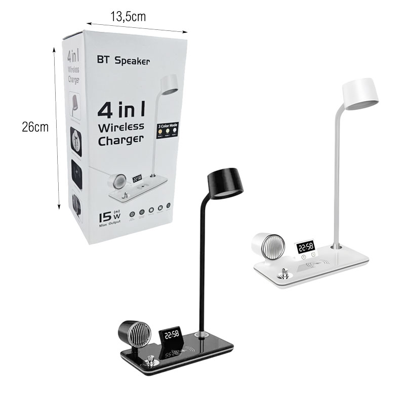 • 4 λειτουργίες σε μία συσκευή: LED φωτιστικό, ασύρματος φορτιστής, ηχείο Bluetooth, ρολόι