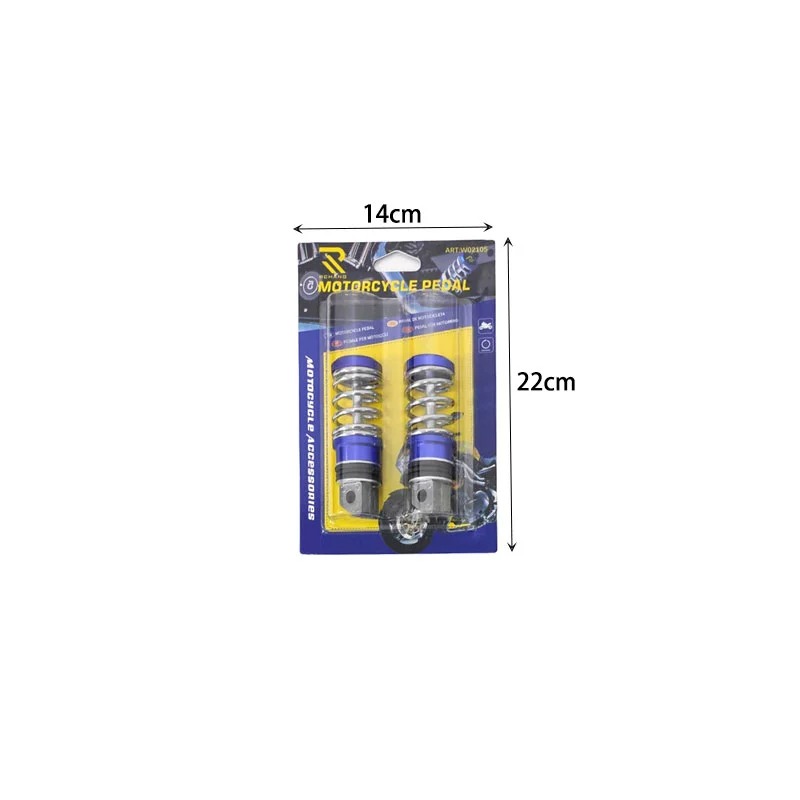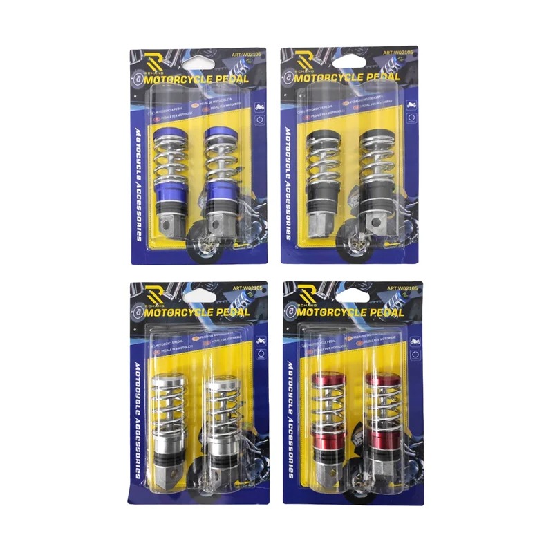 Σετ από 2 πετάλια μοτοσυκλέτας με ελατήριο, σχεδιασμένα για μέγιστη άνεση και σταθερότητα κατά την οδήγηση. Κατασκευασμένα από ανθεκτικό μέταλλο με αντιολισθητική επιφάνεια και απορρόφηση κραδασμών χάρη στο ενσωματωμένο ελατήριο. Διαθέσιμα σε διάφορα χρώματα για να ταιριάζουν σε κάθε τύπο μοτοσυκλέτας.