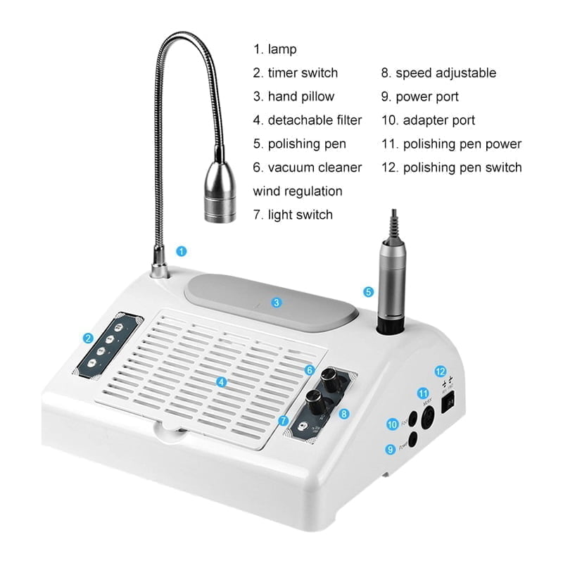 Γενικά Χαρακτηριστικά Έλεγχος ταχύτητας στροφών (κλείδωμα ταχύτητας στις επιθυμητές στροφές) Ρύθμιση φοράς περιστροφής (αριστερόστροφα/δεξιόστροφα) Το φίλτρο μπορεί να επαναχρησιμοποιηθεί ή να αντικατασταθεί Εύκολη αλλαγή φίλτρου Θερμικό υπερφόρτωσης Ψηφιακός έλεγχος 6 κεφαλές λείανσης Τεχνικά Χαρακτηριστικά Τάση: 100-240V / 50-60Hz Ισχύς λαμπτήρα: διακόπτης διπλός 48 / 96 W Συλλέκτης σκόνης: 80W Ταχύτητα τροχού: 30000rpm Μέγεθος: 31 x 27.5 x 12.5 cm Βάρος: 2.8kg