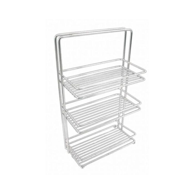 Ραφιέρα μπάνιου, μεταλλική τριώροφη, με ίνοξ εμφάνιση, για την αποθήκευση αναλώσιμων μπάνιου, συμπεριλαμβάνονται και οι βίδες στήριξης.