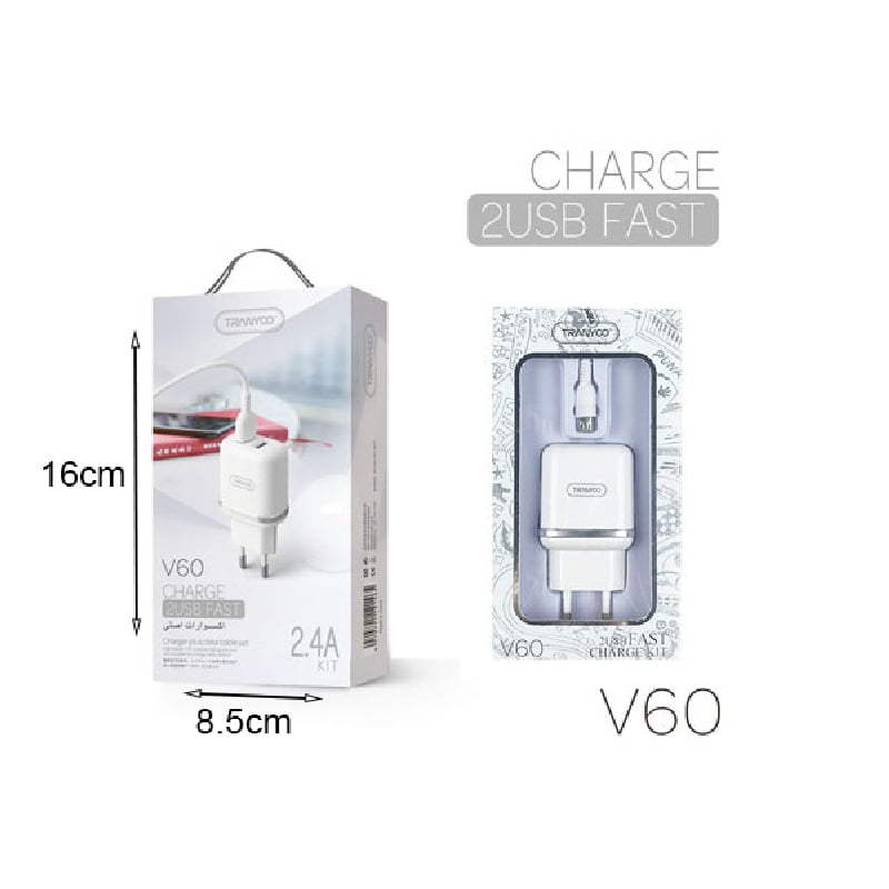 Tranyoo Φορτιστής με καλώδιο micro 2USB V60 2.4A – Charger 2USB Fast