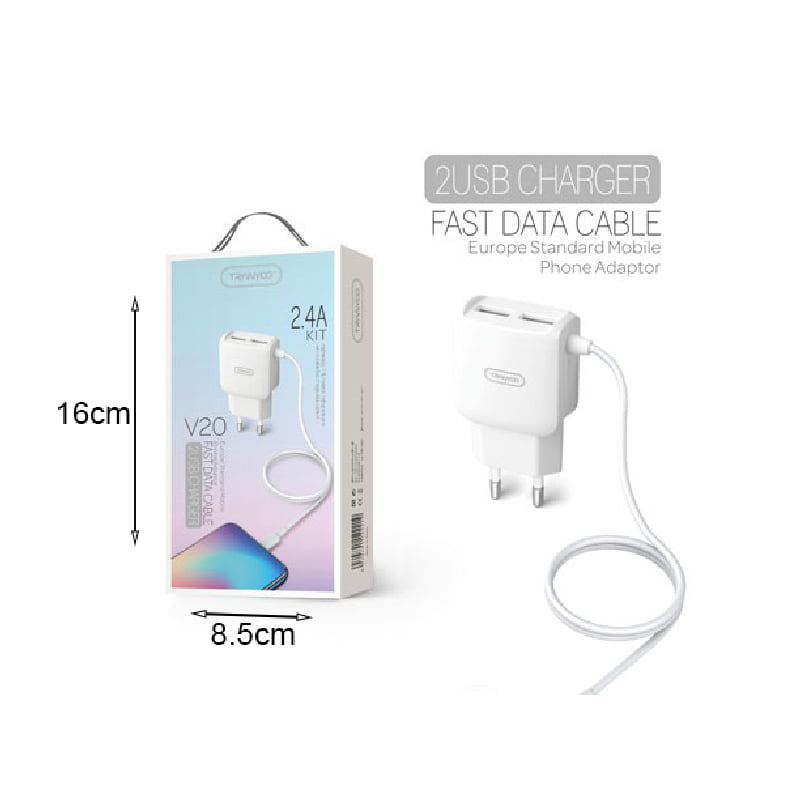 Tranyoo Φορτιστής με καλώδιο Type-C 2USB V20 2.4A – Charger 2USB Fast