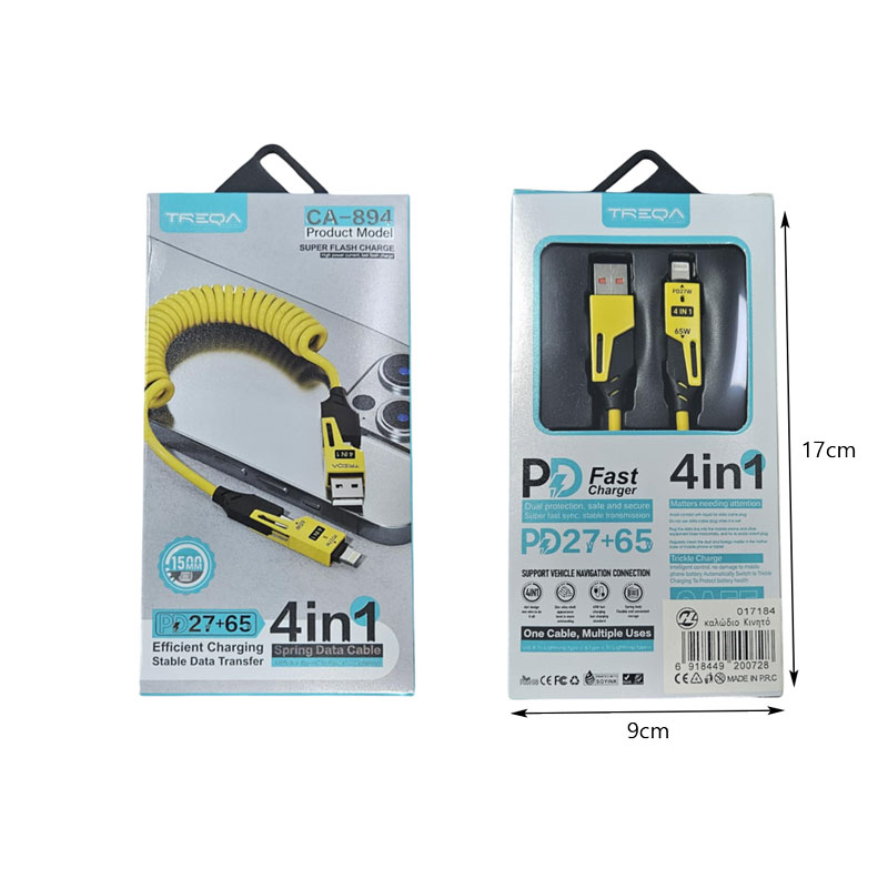 Το Treqa CA-894 είναι ένα έξυπνο και πρακτικό 4 σε 1 καλώδιο δεδομένων με ελατηριωτό σχεδιασμό, ιδανικό για όσους χρειάζονται πολλαπλές επιλογές φόρτισης σε μία λύση. Υποστηρίζει Super Flash Charge για γρήγορη και αποτελεσματική φόρτιση, ενώ εξασφαλίζει σταθερή μεταφορά δεδομένων χωρίς διακοπές. Με μήκος 1500mm, είναι ιδανικό για χρήση στο σπίτι, το γραφείο ή το αυτοκίνητο.