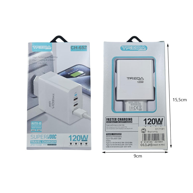 Ο Treqa CH-652 είναι ένας πανίσχυρος φορτιστής ταξιδίου 120W, ιδανικός για όσους χρειάζονται γρήγορη και ασφαλή φόρτιση πολλαπλών συσκευών ταυτόχρονα. Με 2 θύρες PD και 1 θύρα USB, υποστηρίζει ταχεία φόρτιση (fast charge) και τεχνολογία Auto-ID για αυτόματη αναγνώριση και βέλτιστη απόδοση ανάλογα με τη συσκευή. Ιδανικός για smartphones, tablets και laptops.