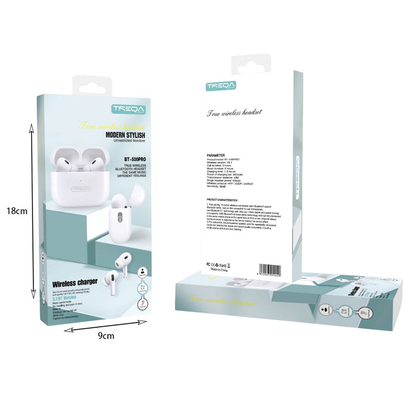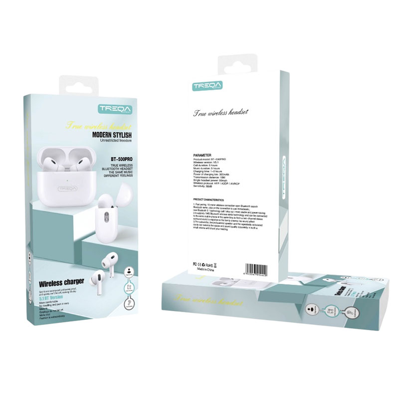 Τα earbud ασύρματα ακουστικά TREQA BT-500 PRO συνδέονται με κάθε συσκευή που διαθέτει bluetooth. Συνοδεύονται από θήκη μεταφοράς και φόρτισης των ακουστικών.