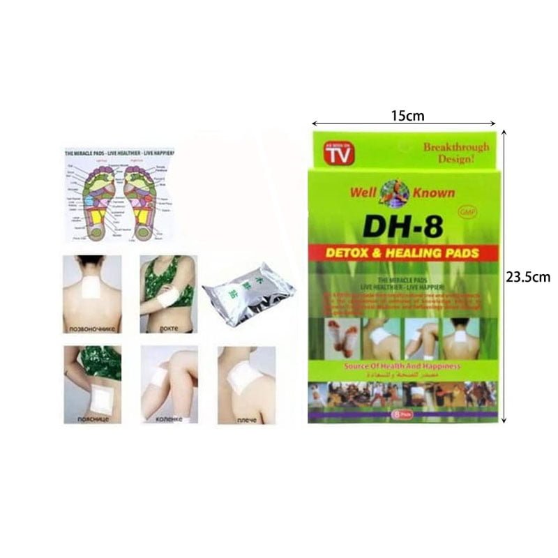 Τα επιθέματα DH-8 βοηθούν στην ανακούφιση των συμπτωμάτων που σχετίζονται με ρευματοειδής αρθρίτιδα, αρτηριακή πίεση, οφθαλμική όραση, δερματικά προβλήματα, άγχος, σοβαρή κόπωση, πονοκεφάλους, εξάψεις, μεταβολές της διάθεσης, εξάλειψη τοξικότητας βαρέων μετάλλων, ασθένεια Crohn, ινομυαλγία, κακή κυκλοφορία και κάθε είδους προβλήματα υγείας. Το πέλμα του ποδιού είναι ο τόπος όπου περνάνε τα περισσότερα νεύρα, επομένως τα επιθέματα αποτοξίνωσης και θεραπείας DH-8 χρησιμοποιούνται καλύτερα στο πέλμα του ποδιού καθώς και στην προβληματική περιοχή του σώματος μας για να καθαρίσουμε τα βλαβερά και τοξικά υλικά από τον οργανισμό μας.